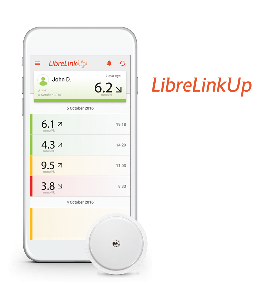 ‡‡ The LibreLinkUp app is only compatible with certain mobile devices and operating systems. Please check www.librelinkup.com for more information about device compatibility before using the app. Use of LibreLinkUp and FreeStyle LibreLink requires registration with LibreView. The LibreLinkUp app is not intended to be a primary glucose monitor: home users must consult their primary device(s) and consult a healthcare professional before making any medical interpretation and therapy adjustments from the information provided by the app.