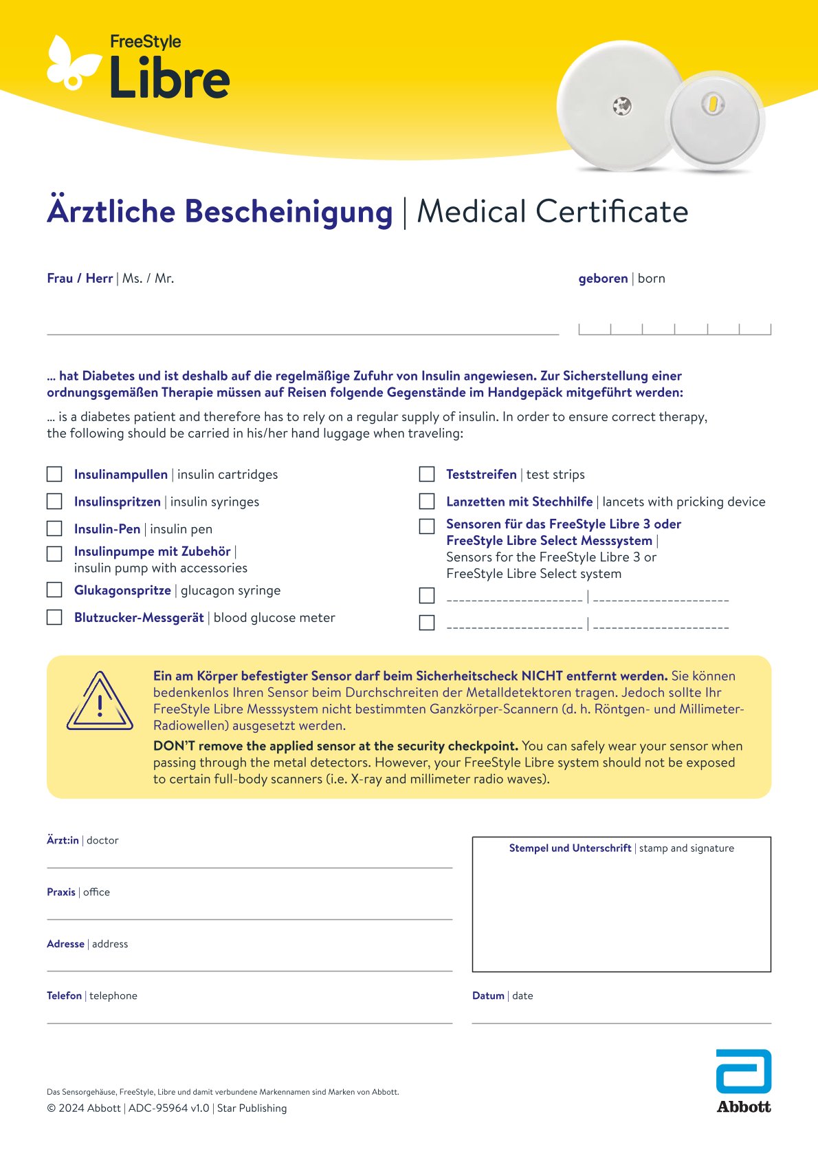 Damit bei Deinem Start in den Urlaub alles glattläuft: Mit diesem Formular kann Dein Praxisteam bestätigen, dass Du Diabeteszubehör im Handgepäck mitführen darfst und der FreeStyle Libre Sensor beim Sicherheitscheck nicht entfernt werden muss. Einfach ausdrucken, ausfüllen lassen und mitnehmen.