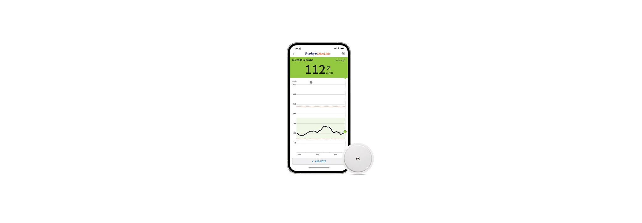 Smartphone screen showing the FreeStyle LibreLink app displaying glucose readings of 112 md/dL