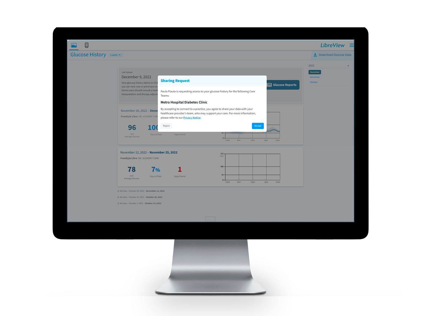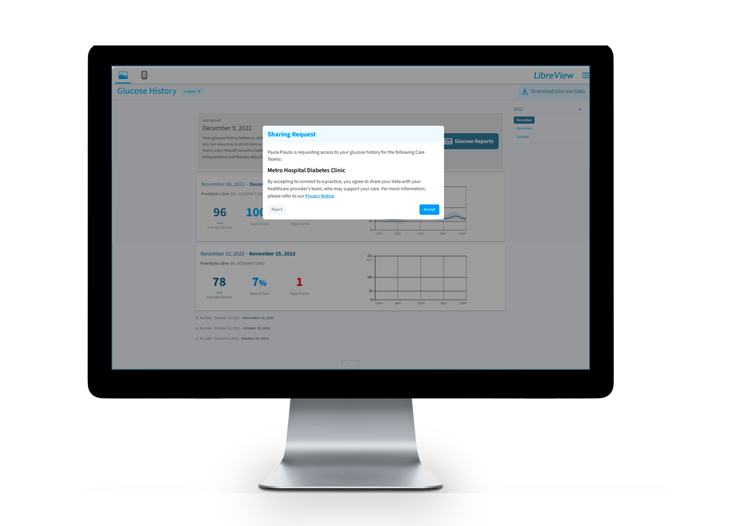 Ask your healthcare provider to invite you to share26 your data. Click Accept Invitation in the email, follow the prompts, and your glucose data will automatically be shared.