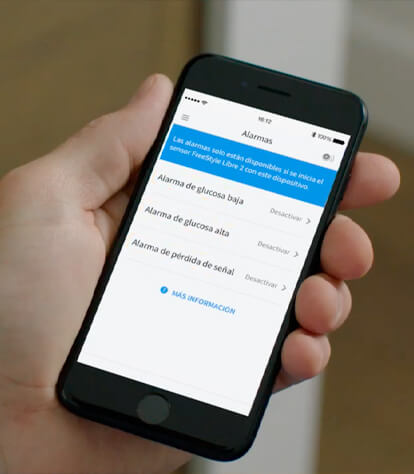 Se pueden configurar 3 tipos de alarmas opcionales: glucosa alta, baja y de pérdida de señal. Con la función de alarmas opcionales activada, la aplicación te avisará cuando la glucosa alcance el valor establecido.