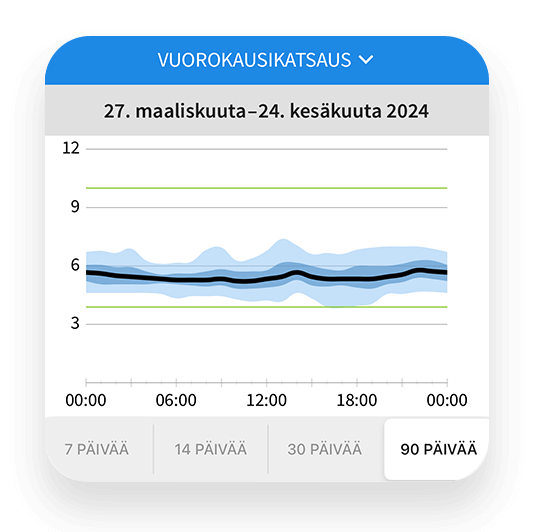 ~ Vuorokausikatsaus edellyttää vähintään 5 päivän glukoositietoja.