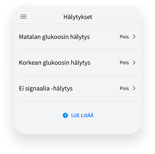 ¤ Ilmoitukset vastaanotetaan vain, kun hälytykset on kytketty PÄÄLLE ja sensori on enintään 6 metrin (20 jalan) päässä älypuhelimesta. Sinun on otettava käyttöön asianmukaiset asetukset älypuhelimessasi saadaksesi glukoosihälytykset, katso lisätietoja FreeStyle Libre 2 -käyttäjän ohjekirjasta.