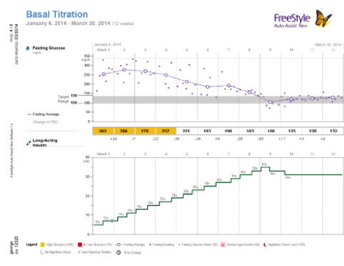 The Basal Titration report compares fasting blood glucose levels with long-acting insulin doses over a 12-week period. The report also shows when long-acting insulin doses have been adjusted based on fasting blood glucose trends.