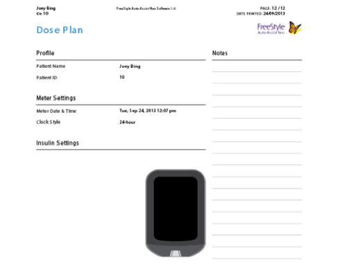The Dose Plan shows you the current meter setup along with the history of settings for spot check therapy and confirmation programming. Insulin settings are displayed visually to reinforce how the patient finds their dose on the meter.