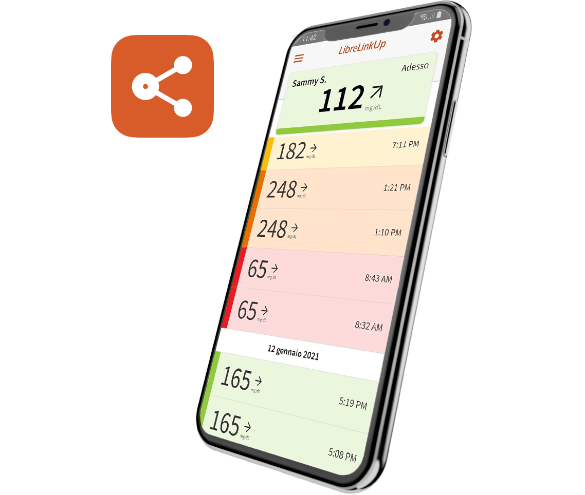 Puoi condividere i tuoi livelli di glucosio fino a un massimo di 20 persone tramite l'app LibreLinkUp.
