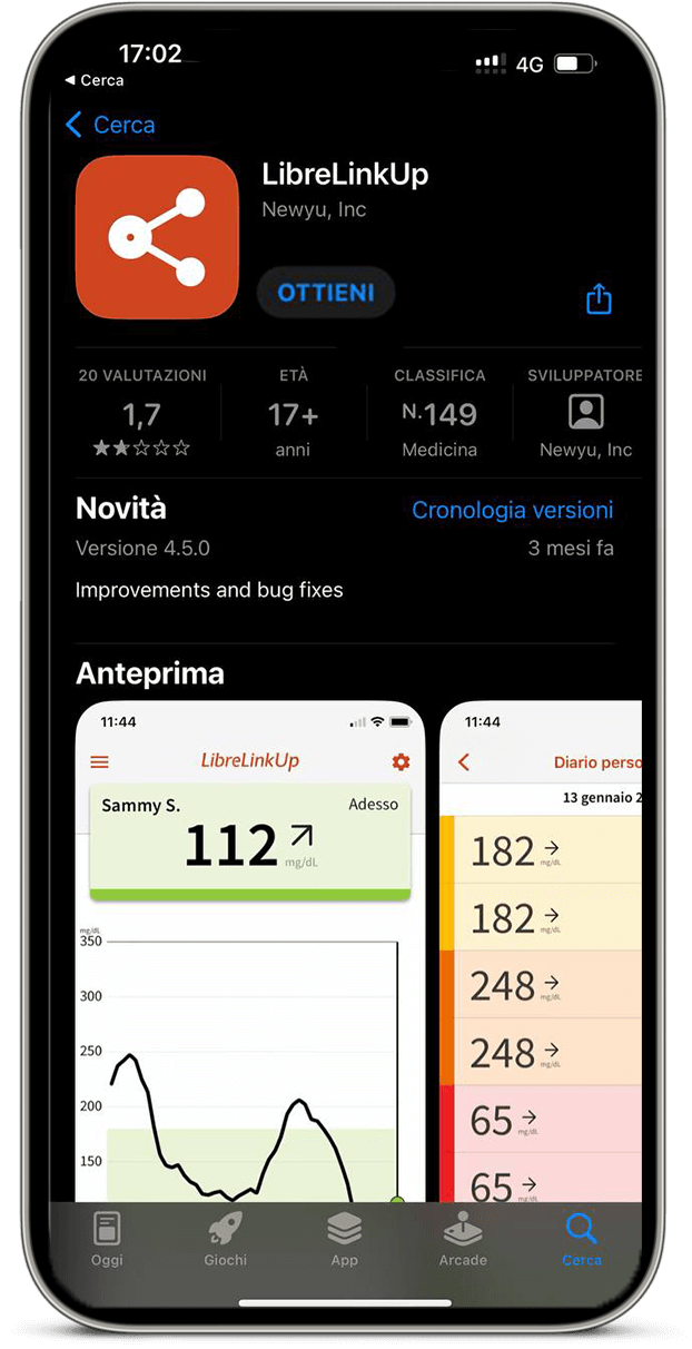 L'app gratuita FreeStyle LibreLink8,9 ti permette di visualizzare il valore e l'andamento del glucosio direttamente sul tuo cellulare9, sempre3 e ovunque4. Vai sugli store, scarica l'app gratuita e segui le istruzioni per l'installazione.