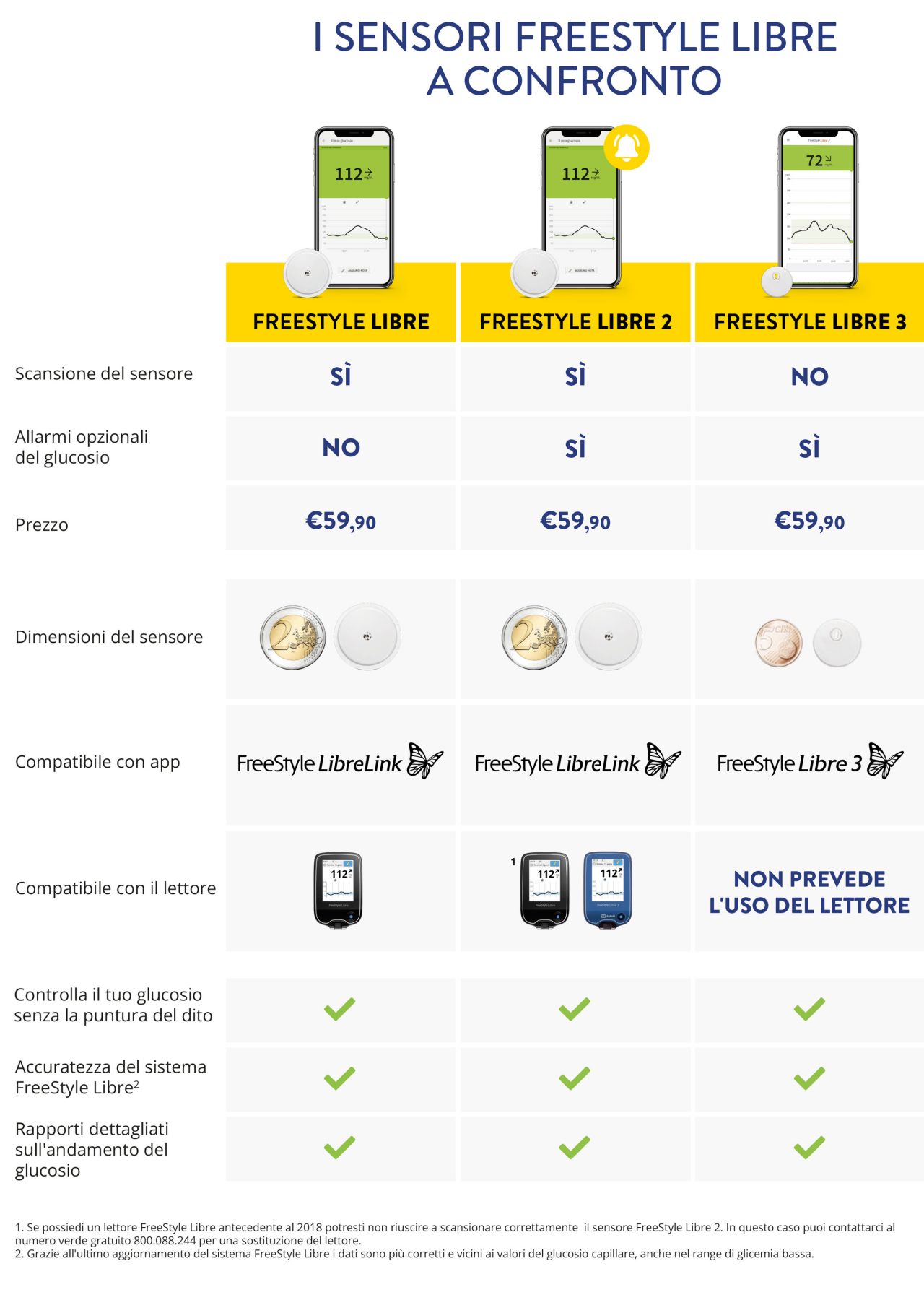 Il prodotto FreeStyle Libre confrontato con FreeStyle Libre 2 e con l'ultimo prodotto FreeStyle Libre 3