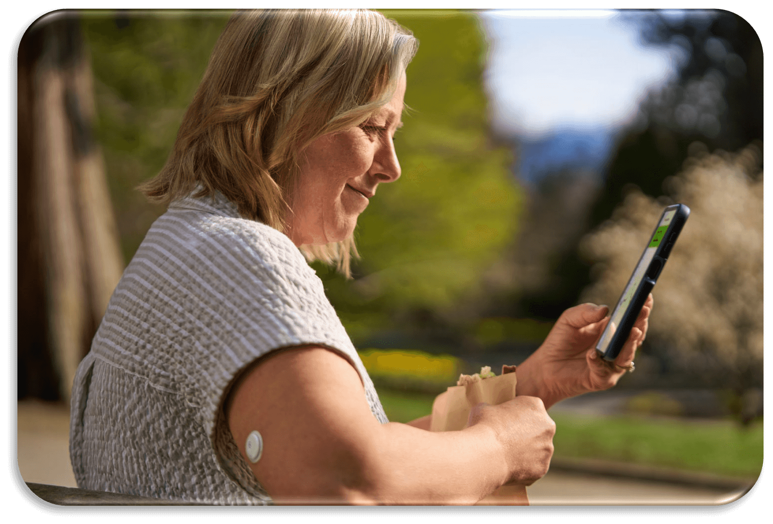 En liten og diskrè4 sensor som man har på baksiden av overarmen, og som måler kontinuelig glukosekosentrasjonen i kroppens vevsvæske. Glukosemålinger hvert minutt, hver time, hver dag i opptil 15 dager. Verdiene overføres til din smarttelefon27 minutt for minutt, slik at du vet når din glukose begynner å bli lav, og du kan handle raskere for å unngå lav glukose
