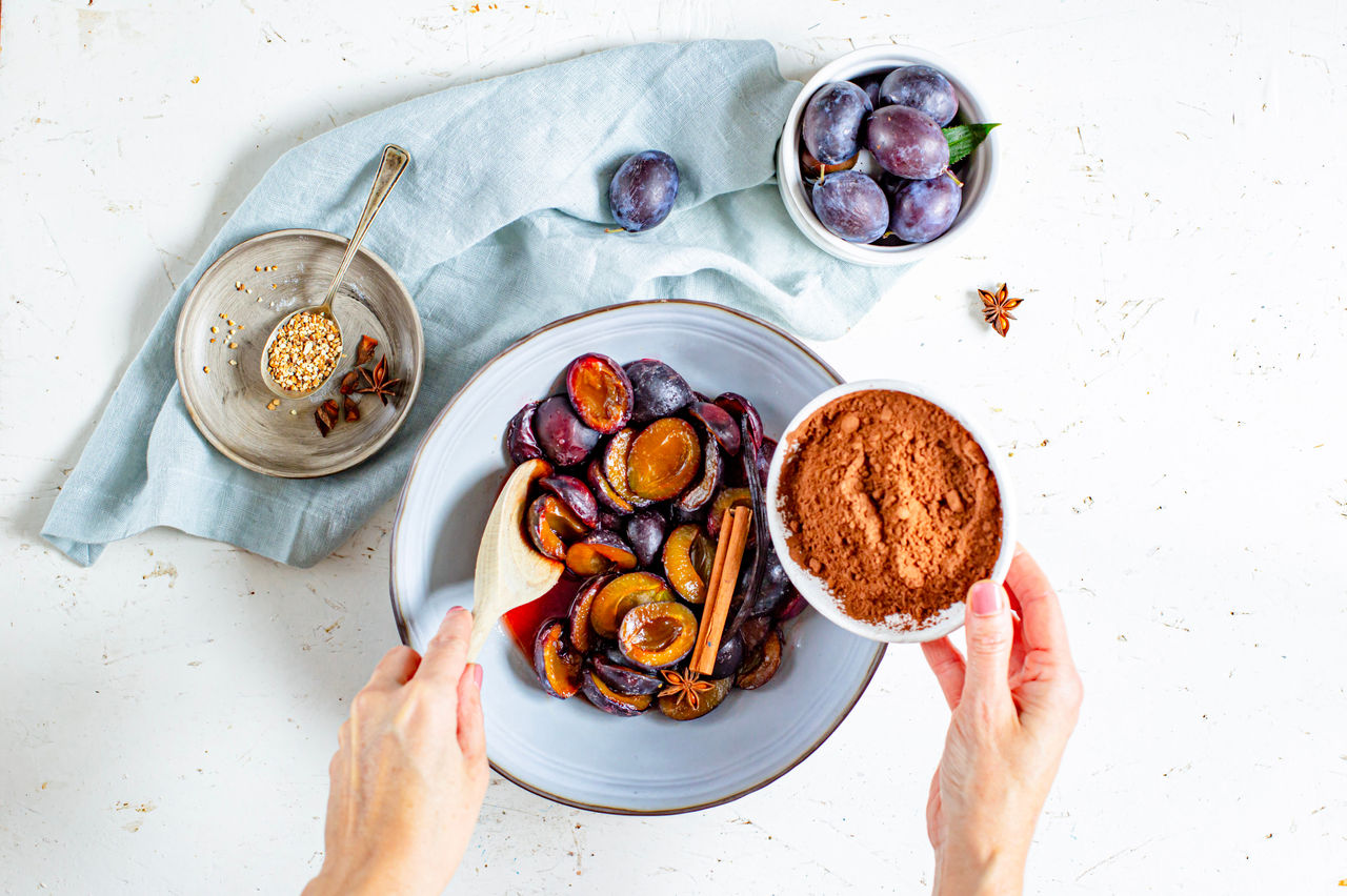 Po około 2,5 godzinach do śliwek dodajemy kakao przesiewając je nad garnkiem oraz erytrol. Mieszamy i smażymy do momentu, gdy śliwki nabiorą konsystencji gęstych powideł.