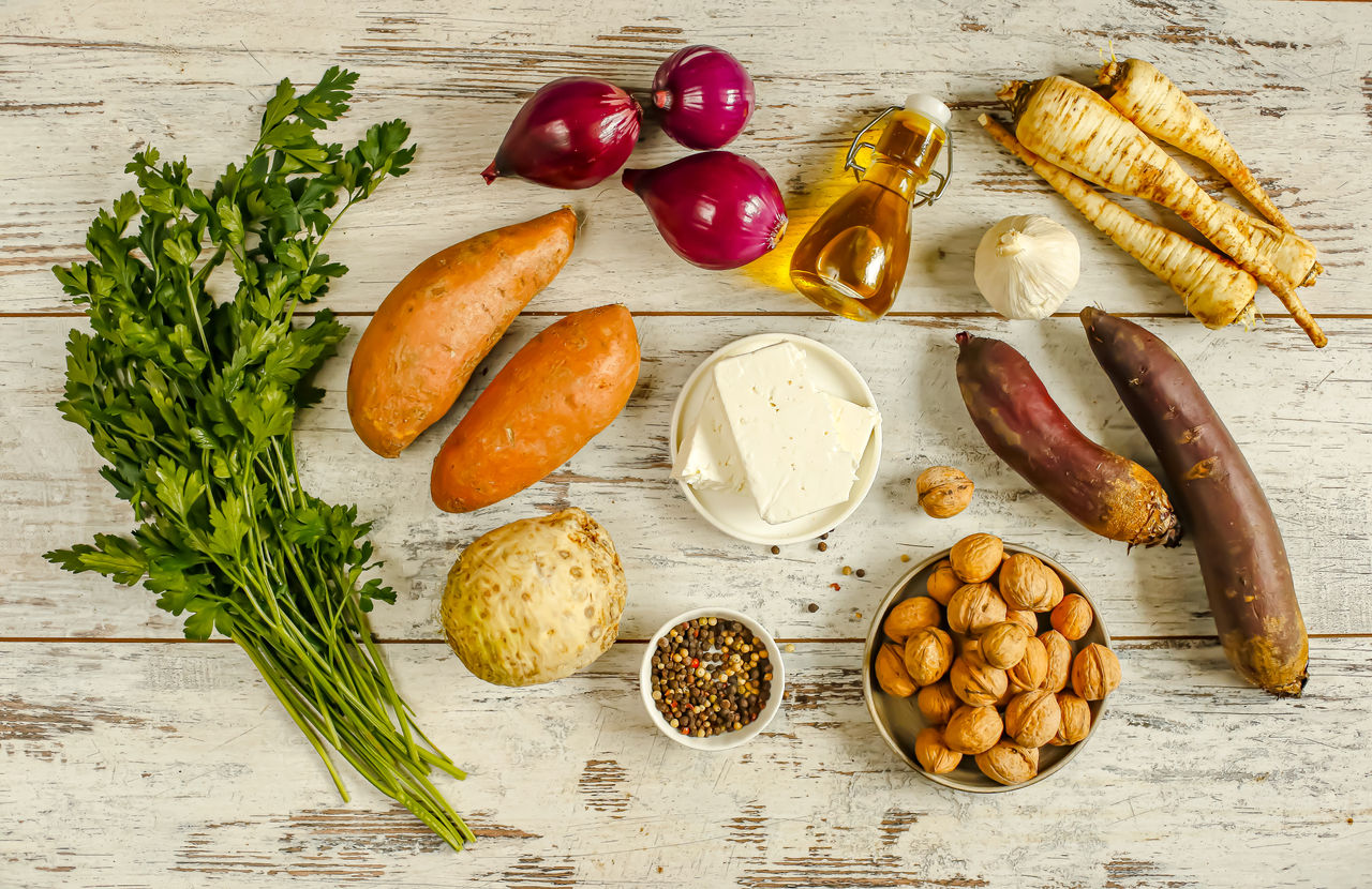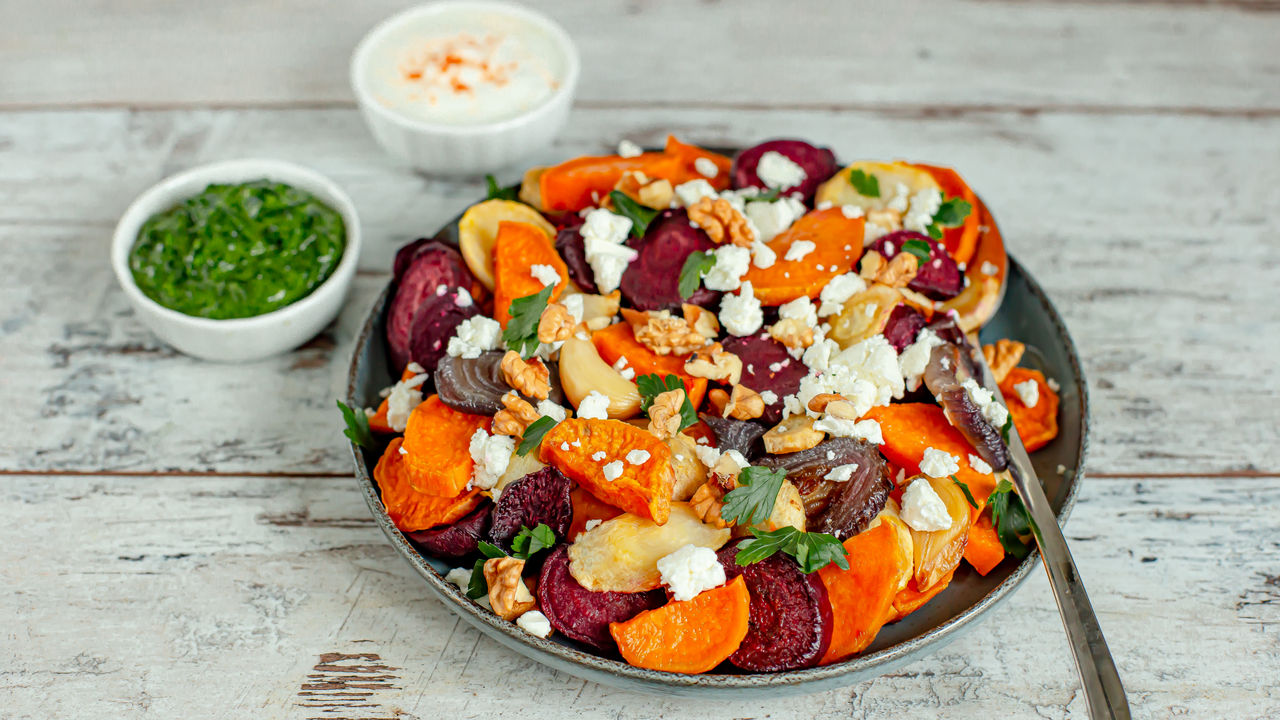 Zima to czas, kiedy szukamy potraw, które nie tylko są smaczne, ale też rozgrzewają i dostarczają energii. Dlatego przygotowaliśmy dla Was przepis na pieczone warzywa korzeniowe z fetą, orzechami włoskimi i aromatycznym dressingiem z natki pietruszki.