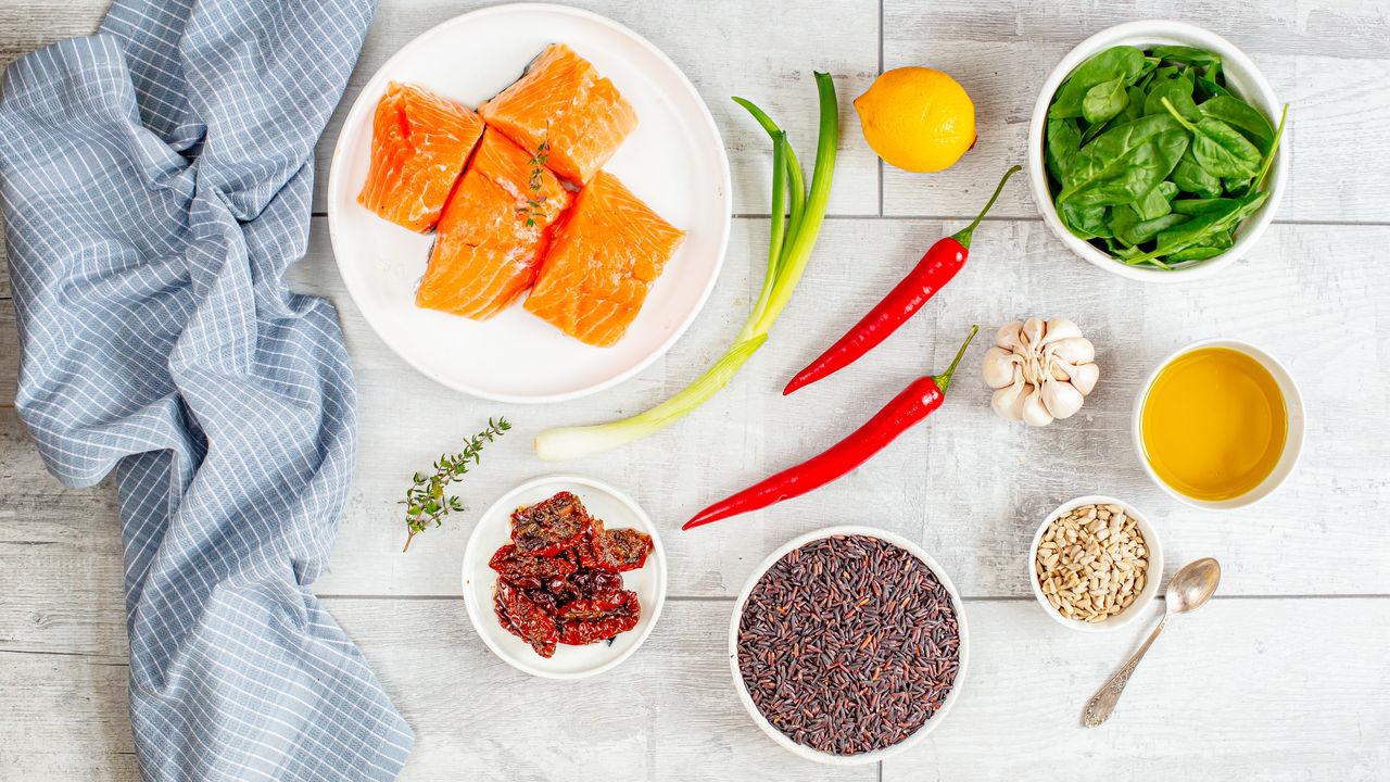 Łosoś pieczony na szpinaku z czarnym ryżem