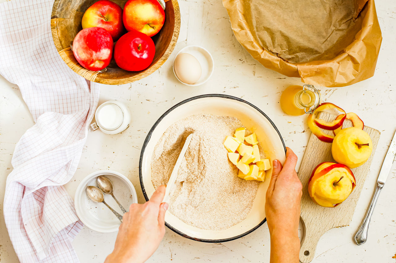 Teraz do suchych składników dodajemy pokrojone w kostkę masło. Wcieramy dłońmi masło w suche składniki.