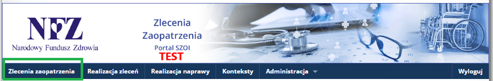 1. Zaloguj się na swoje konto do systemu eZWM, a następnie z górnego menu wybierz „Zlecenia zaopatrzenia”.