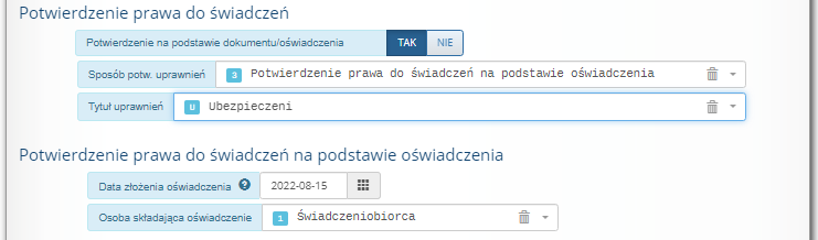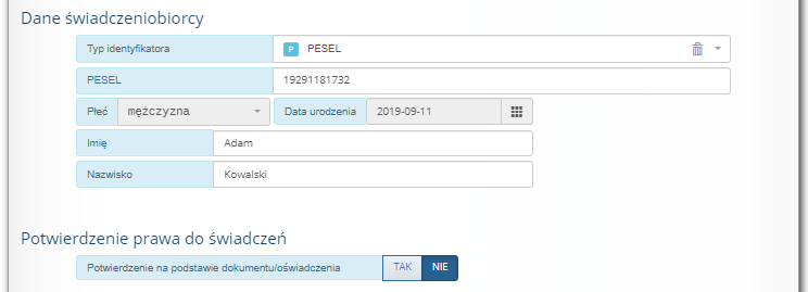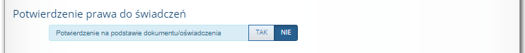 Dla polskich pacjentów, którym przysługuje możliwość otrzymania zlecenia, Prawo do świadczeń można potwierdzić automatycznie w sposób elektroniczny, za pomocą systemów NFZ. Dlatego w polu potwierdzenie na podstawie dokumentu/oświadczenia należy zaznaczyć NIE.