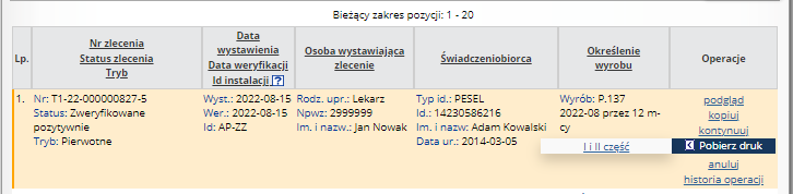 Aby pobrać druk zlecenia jako plik pdf, np. w celu wydrukowania i przekazania pacjentowi, należy kliknąć -> Pobierz druk.