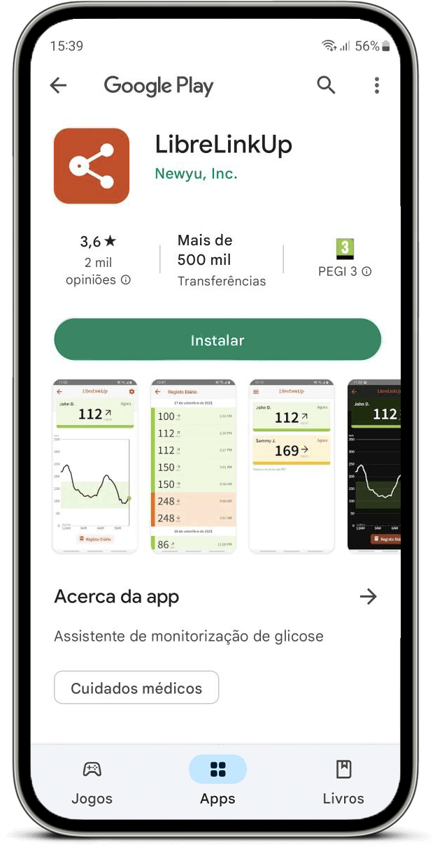 Partilhe os seus dados de glicose com os seus amigos, família e cuidadoresǁ. Com a aplicação LibreLinkUp,§ a sua família e amigos podem receber as suas leituras de glicose no telemóvel. Ideal para pais e cuidadores, a aplicação móvel LibreLinkUp permite-lhes manterem-se atualizados com os valores de glicose, onde quer que esteja.ǁ Vá à app store do seu dispositivo para descarregar gratuitamente1 e siga as instruções de configuração.