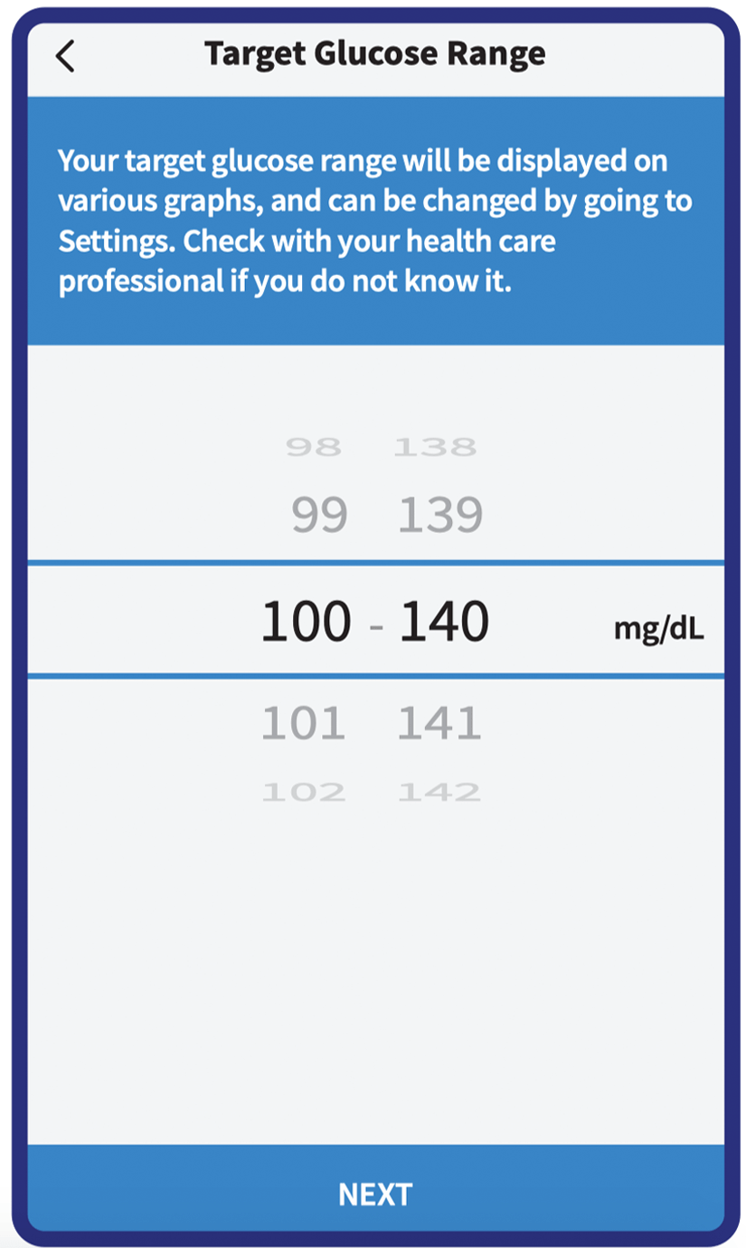 Review important information about glucose readings, when to do a blood glucose test, and where to apply a sensor. Tap NEXT to proceed til you see the SCAN NEW SENSOR screen.