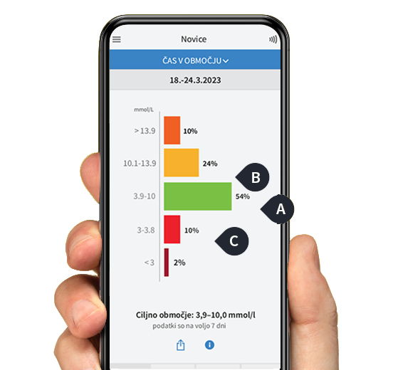 Spremljajte trende in vzorce na vaši napravi in ugotovite, kako uspešno ste obvladovali raven glukoze v določenem časovnem obdobju.