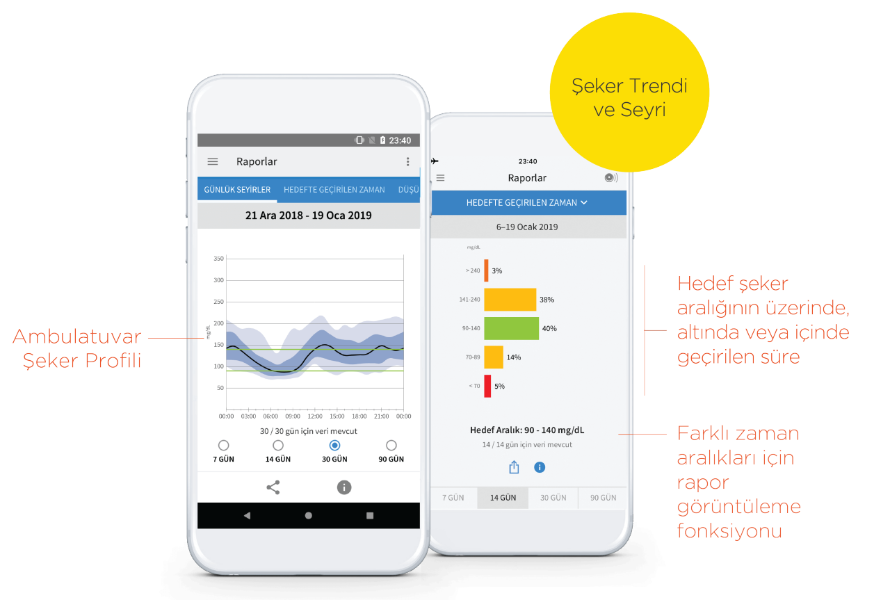 FreeStyle LibreLink uygulaması veya okuyucundan görebileceğin "Günlük Trendler", "Hedefte Geçirilen Zaman" raporları ve "Trend Okları" özelliği sayesinde, bahsettiğimiz glukoz değişkenliğini kontrol altına alıp sağlık uzmanınla birlikte daha iyi bir diyabet yönetimi gerçekleştirebilirsin.