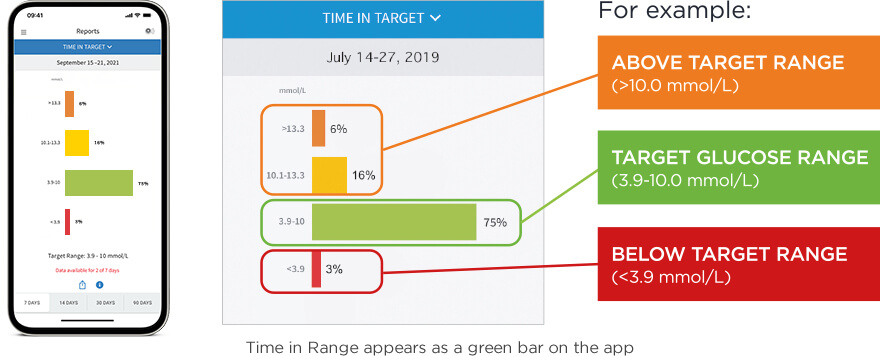 Time in Range is the percentage of readings and time per day you spend within your target glucose range.