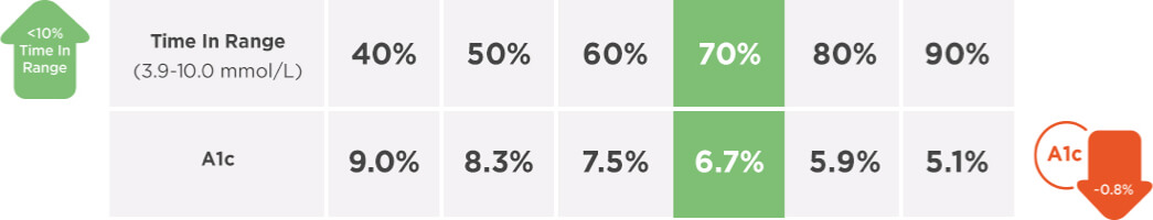 Every 10% increase in Time in Range = ~0.8% decrease in HbA1c.4