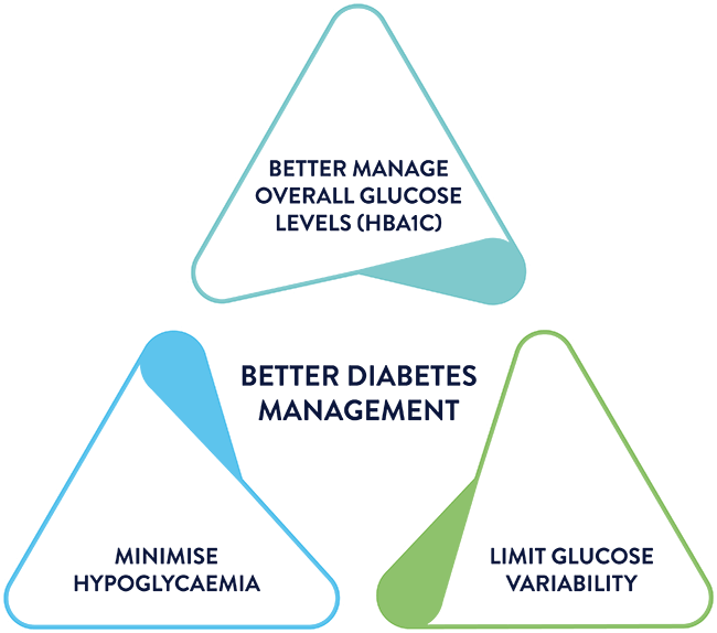 The Triangle of Diabetes acknowledges that improving your HbA1c is important, but it also emphasises the need to minimise hypoglycaemia and limit glucose variability.