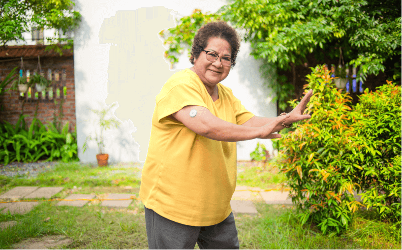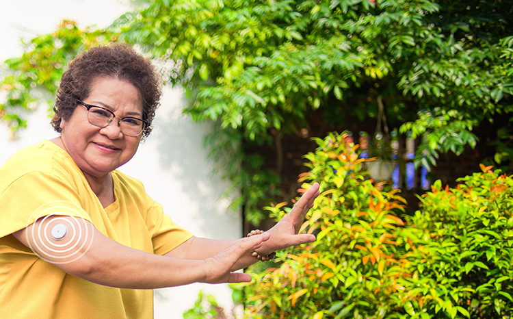 A woman wearing a Freestyle Libre sensor and scanning the data with a reader