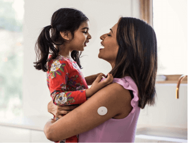 A woman wearing a Freestyle Libre sensor and scanning the data with a reader